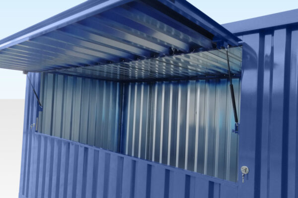 Doppeltür-Flat-Pack-Container mit seitlich öffnender Klappe (mit Scharnieren oben) an der 4m-Seite. Diese Klappe kann auf einer der langen Seiten positioniert werden, je nach Ihren Anforderungen.
